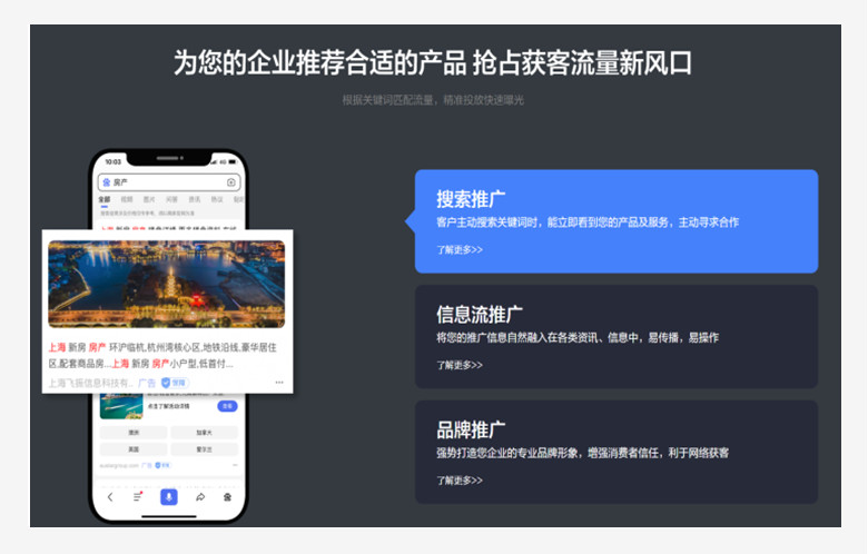所有百度系列产品我们都做百度推广,百度信息流强强联合,有效的提升企业的客户线索。